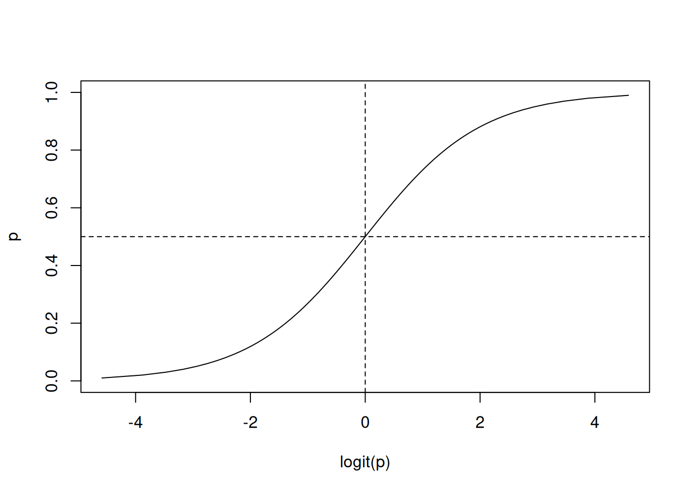 The logit function links the probability p to the linear regression by converting a number in the probability range \([0,1]\) to the range \([-\infty,+\infty]\).
