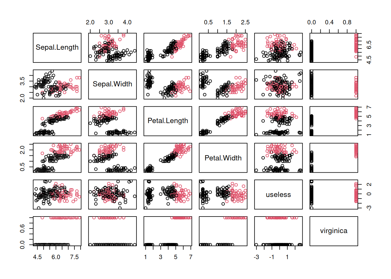 x <- cbind(x, useless = rnorm(nrow(x)))We create a binary classification problem by